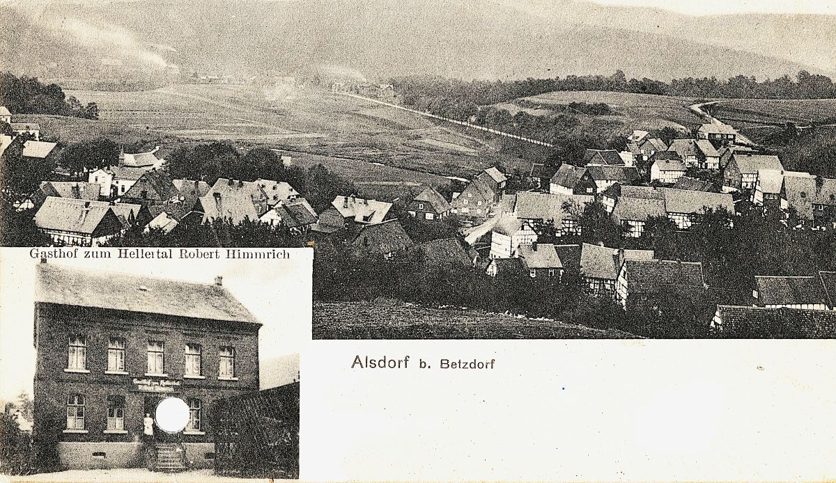 Neben einer Ortsansicht aus dem frühen 20. Jahrhundertder Blick geht vom Alsberg über die Dorfmitte zur Haltestelle, ist unten links der Gasthof Hellertal abgebildet. Der damalige Wirt Robert Himmrich war der Großvater von dem heutigen Pächter Willi Himmrich.