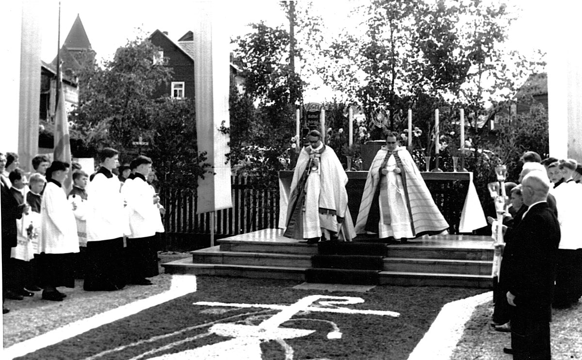 Fronleichnamsprozession in Alsdorf. Vier Altäre wurden dafür von den Anliegern aufgebaut und mit Blumenteppichen geschmückt: auf dem Parkplatz Cafe Buchenscheidt, auf dem Schulhof, in der Ortsmitte beim heutigen Bürgerhaus und vor der Kirche. Hier ein Foto des Altars an der Schule. Rechts im Bild Pfarrer Rudolf Müller.