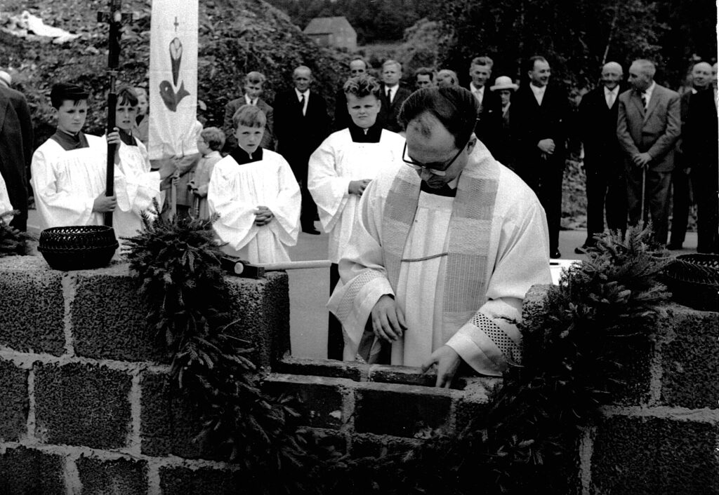 Grundsteinlegung für den katholischen Kindergarten am 11. Juli 1965 durch Pfarrer Rudolf Müller.