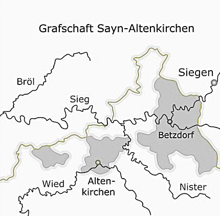 Die Karte zeigt die Gebiete der ehemaligen Grafschaft Sayn – Altenkirchen, die ab 1741 zum Markgrafentum Ansbach gehörten (der Herrschersitz Ansbach ist eine Stadt südwestlich von Nürnberg).