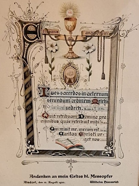 Urkunde für die 1. hl. Messe des Priesters Wilhelm Himmrich am 12. August 1920 (aufbewahrt im Hüttenschulzenhaus)