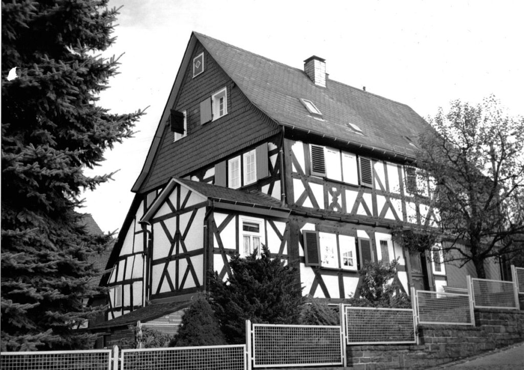 Das Wohn- und Geschäftshaus der Familie Otto Weger in der Hauptstraße, gleich neben der Alten Schule. Im Erdgeschoss war der Lebensmittellladen untergebracht, in dem auch die eigenen Backwaren verkauft wurden. Die Backstube befand sich auf der Rückseite des Gebäudes im Untergeschoss.
