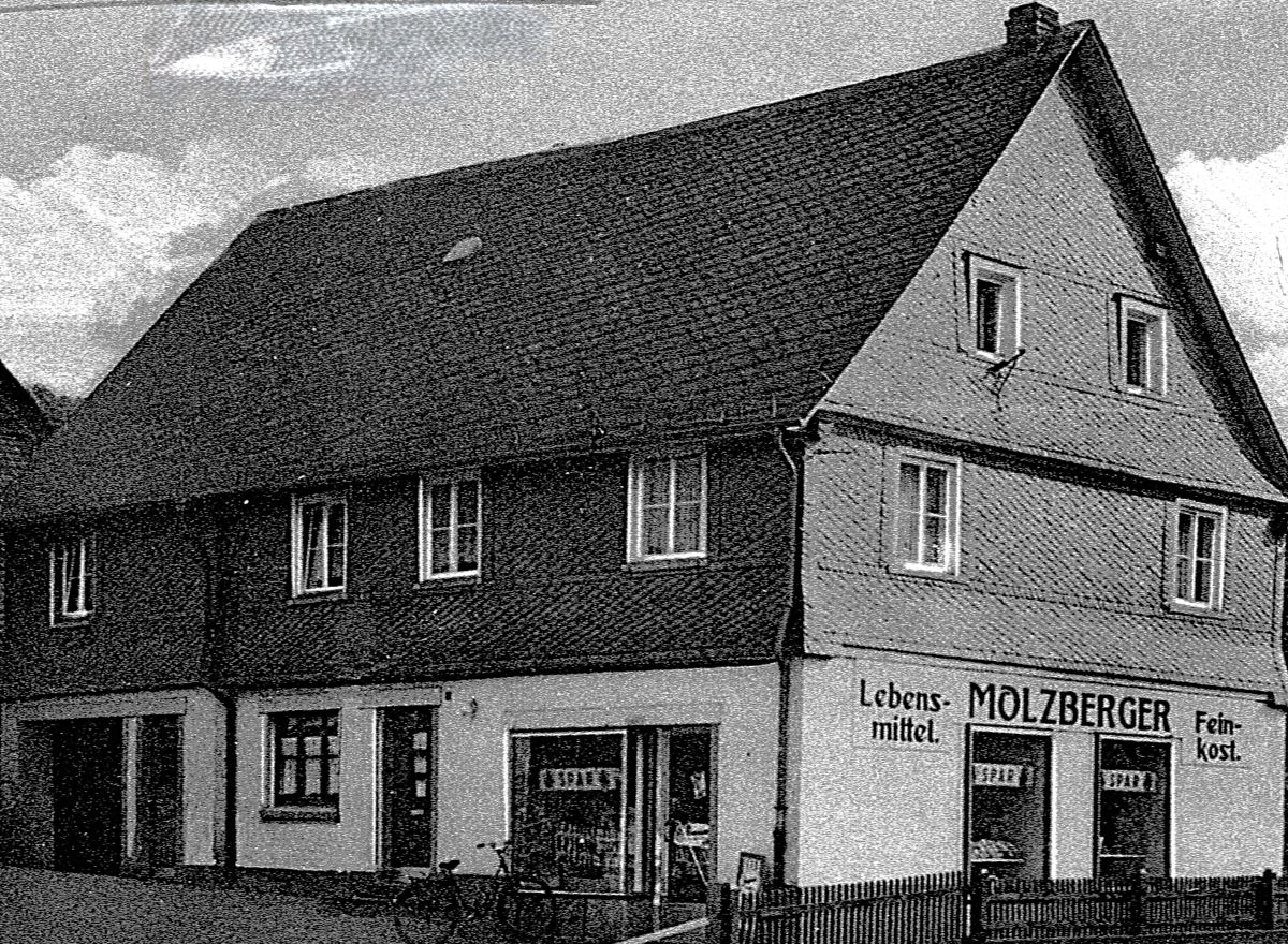 Das Wohn- und Geschäftshaus der Familie Molzberger. Über viele Jahre existierten damit in der Ortsmitte in unmittelbarer Nähe drei Lebensmittelgeschäfte: das Geschäft Achenbach (im abgerissenen Anbau des heutigen Bürgerhauses, das Lebensmittelgeschäft von Otto Reeh und das Geschäft Molzberger.