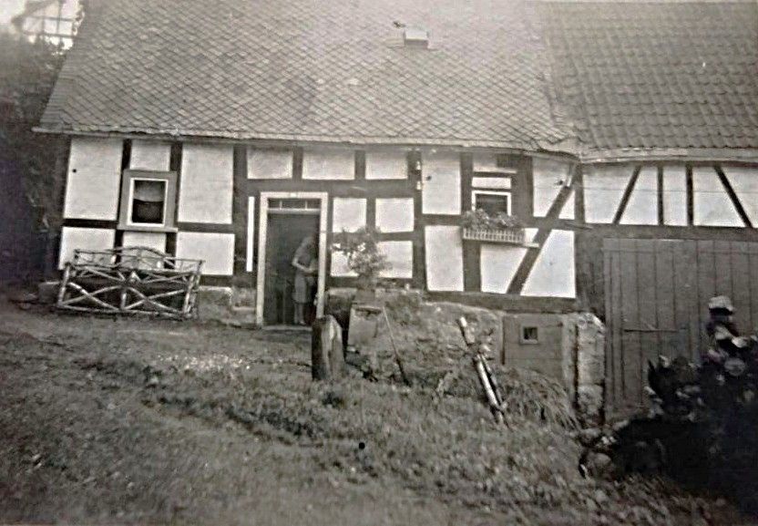 Die Häuser Zöller und Staudt am Anfang des Hofackers. Die kleine Brücke im Vordergrund führte über den Steinerother Bach, der damals noch nicht verrohrt war. Das Haus Zöller wurde abgerissen und der Platz neu bebaut.