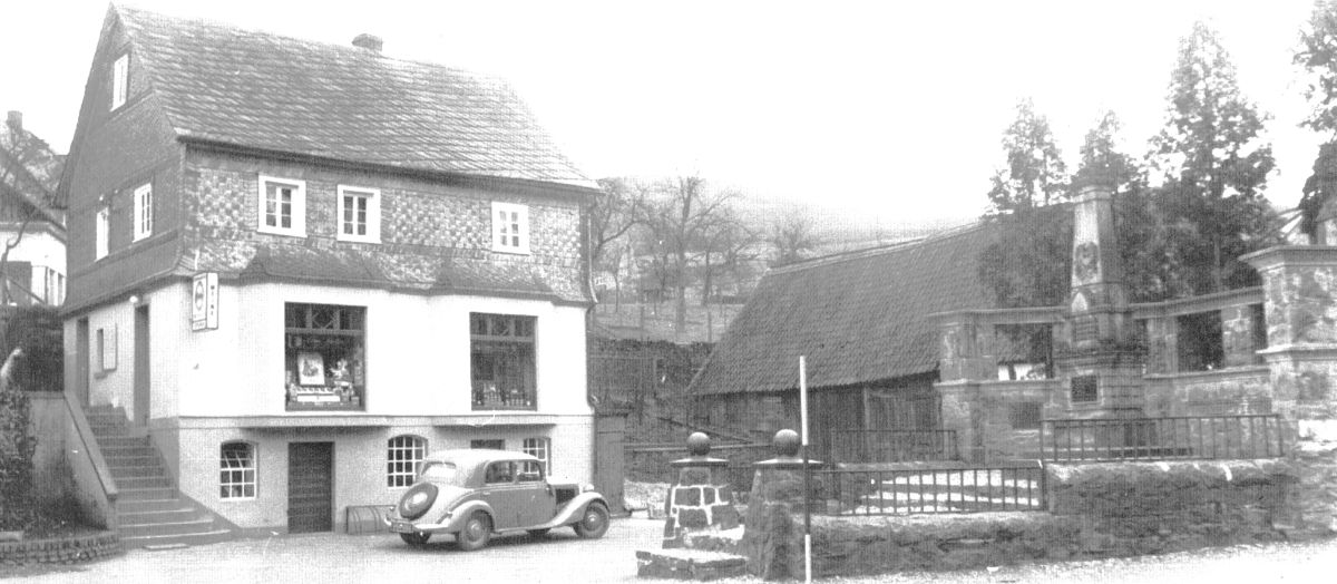 Der Kolonialwarenladen von Otto Reeh in dem alten Wohnhaus, das später abgerissen und durch einen Neubau ersetzt wurde. Der Laden wurde in einen links neben dem neuen Wohnhaus erbauten Flachbau ausgelagert. Rechts im Bild das alte Kriegerdenkmal, das Ende der 1950-iger Jahre wegen einer Verbreiterung der Straße weichen musste. Dahinter ist noch die Scheune der Familie Göldner zu erkennen, in der früher eine Schmiede untergebracht war.