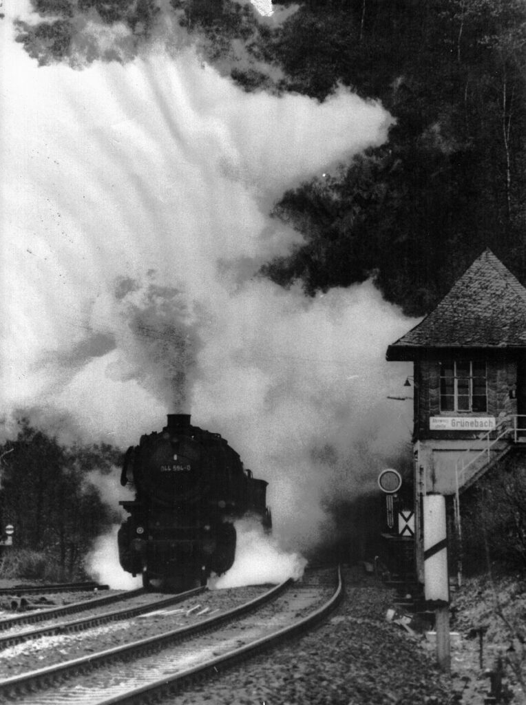 Der Bahnhof „Grünebach“ an der Strecke Betzdorf – Daaden, die im Jahre 1886 eröffnet wurde. Über Jahrzehnte befuhr der Schienenbus diese Strecke. Der Bahnhof war von früh morgens bis spät abends besetzt. Die Schranken mussten schließlich noch händisch bedient werden (die Kurbel ist am rechten Bildrand zu sehen). Neben der Bedienung der Schranken verkaufte der Mitarbeiter der Bahn auch noch Fahrkarten. Zeitweise wurden hier sogar noch Pakete und Gepäck abgefertigt und in dem etwas höheren Gebäudeteil gelagert.