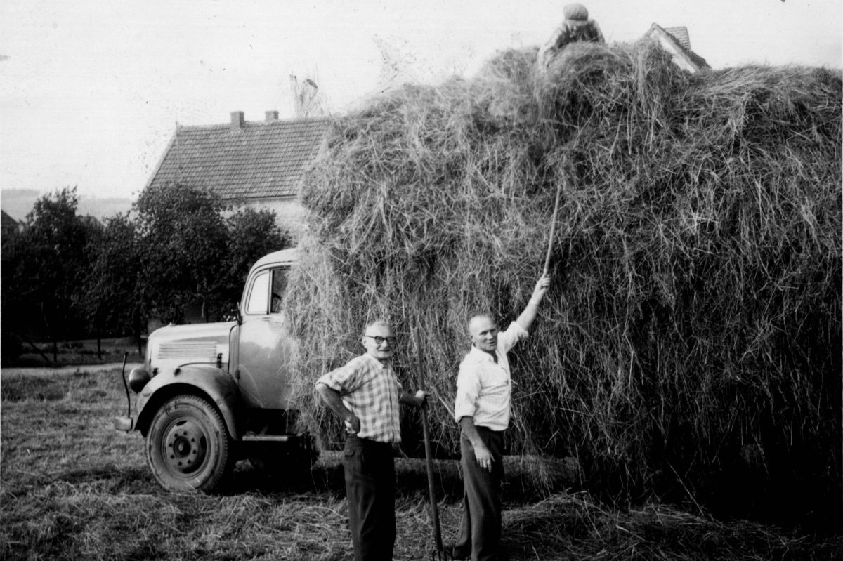 Heuernte am 7. August 1960 auf dem Kreuzland. Da hatte der LkW das Pferdefuhrwerk bereits verdrängt.