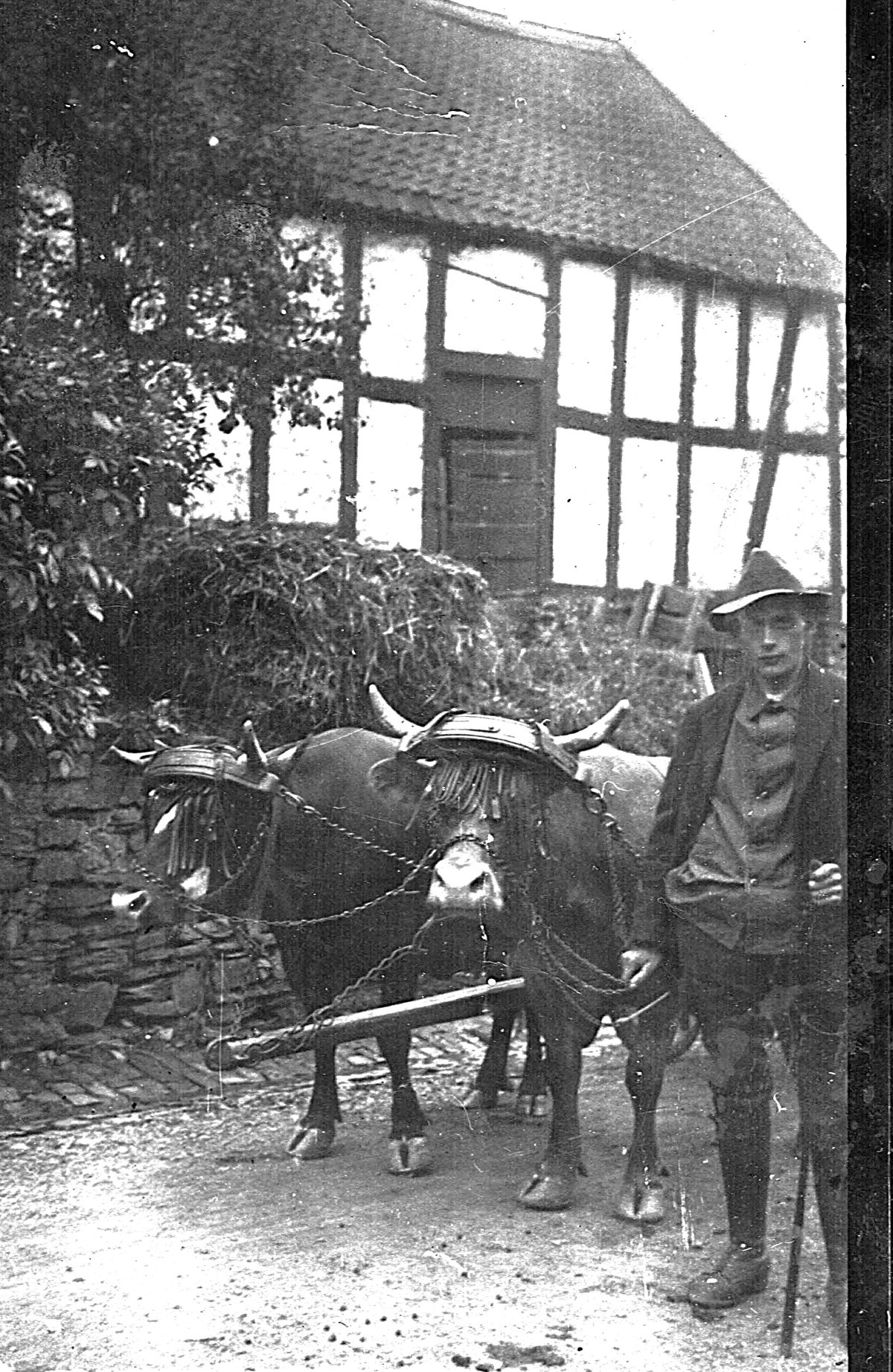 Kühe waren nicht nur Milch- und Fleischlieferanten. Sie wurden auch im Wald und auf dem Feld als Zugtiere eingesetzt. Dieses Gespann hat sich auf dem Höfgen aufgestellt.