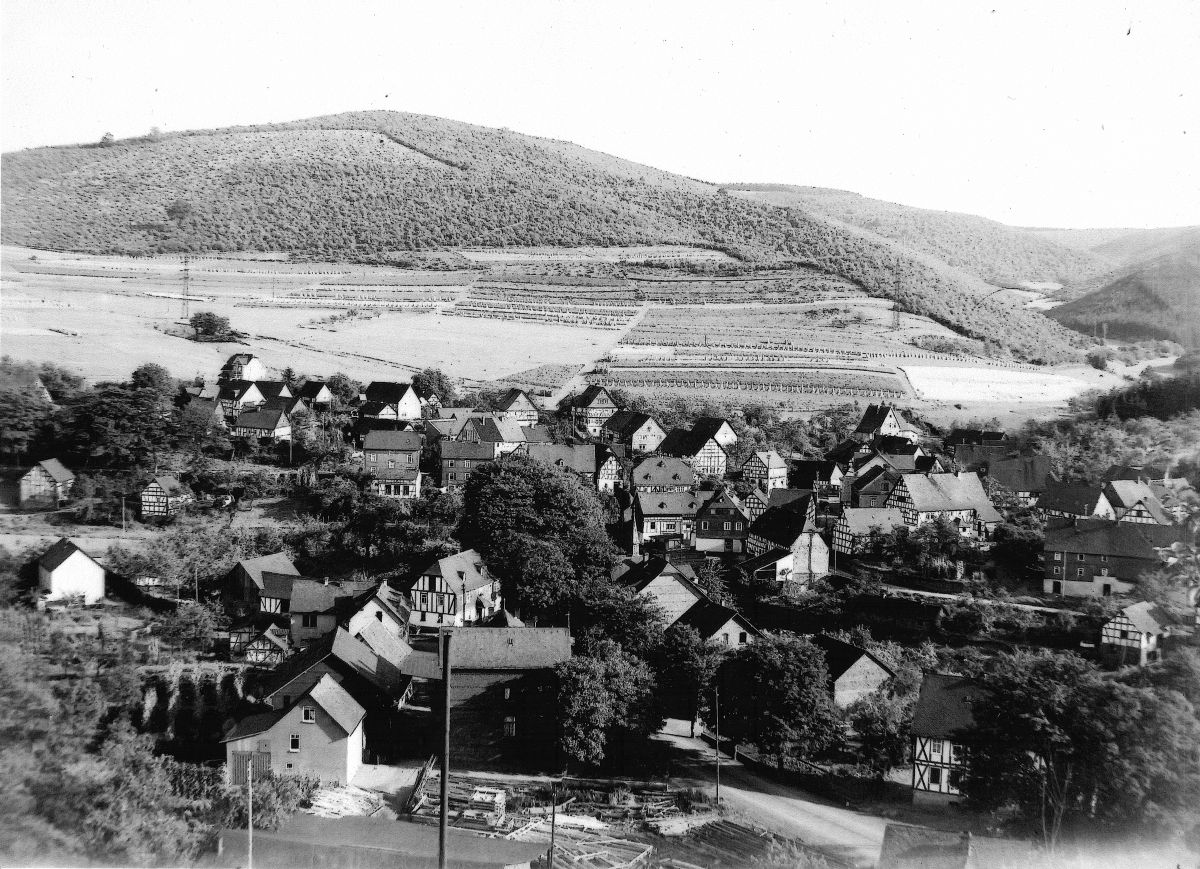 Der Blick geht vom Hofacker über die Geishardt, die Dorfmitte mit der alten Schule in der Bildmitte in Richtung Haltestelle. An Hand der Bebauung lässt sich das Foto auf die Zeit vor dem 2. Weltkrieg datieren. Das Ebenland ist noch komplett unbebaut. Am Schutzbacher Weg stehen lediglich die Häuser Molzberger und Haubrich, und entlang der Hauptstraße stehen noch die imposanten Strßenbäume, die in den 1960-iger Jahren dem Straßenausbau weichen mussten.