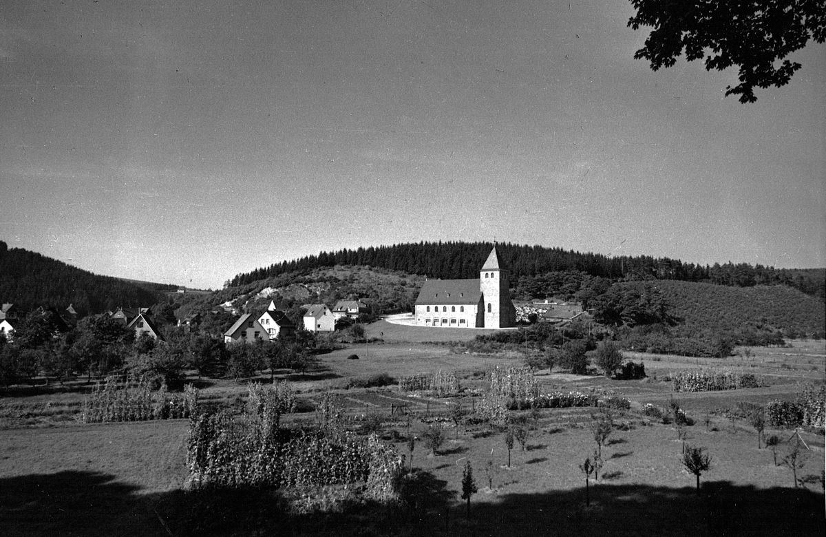 Blick auf die katholische Kirche vom Alsberg aus. Am linken Bildrand ist noch gut der Steinbruch zu erkennen, in dem die Steine für den Neubau der Kirche gebrochen wurden. Im Hintergrund ist der Qualm aus dem Schornstein der Grünebacher Hütte zu erkennen. Das Bild muss also vor 1963 entstanden sein, denn da wurde die Hütte stillgelegt.