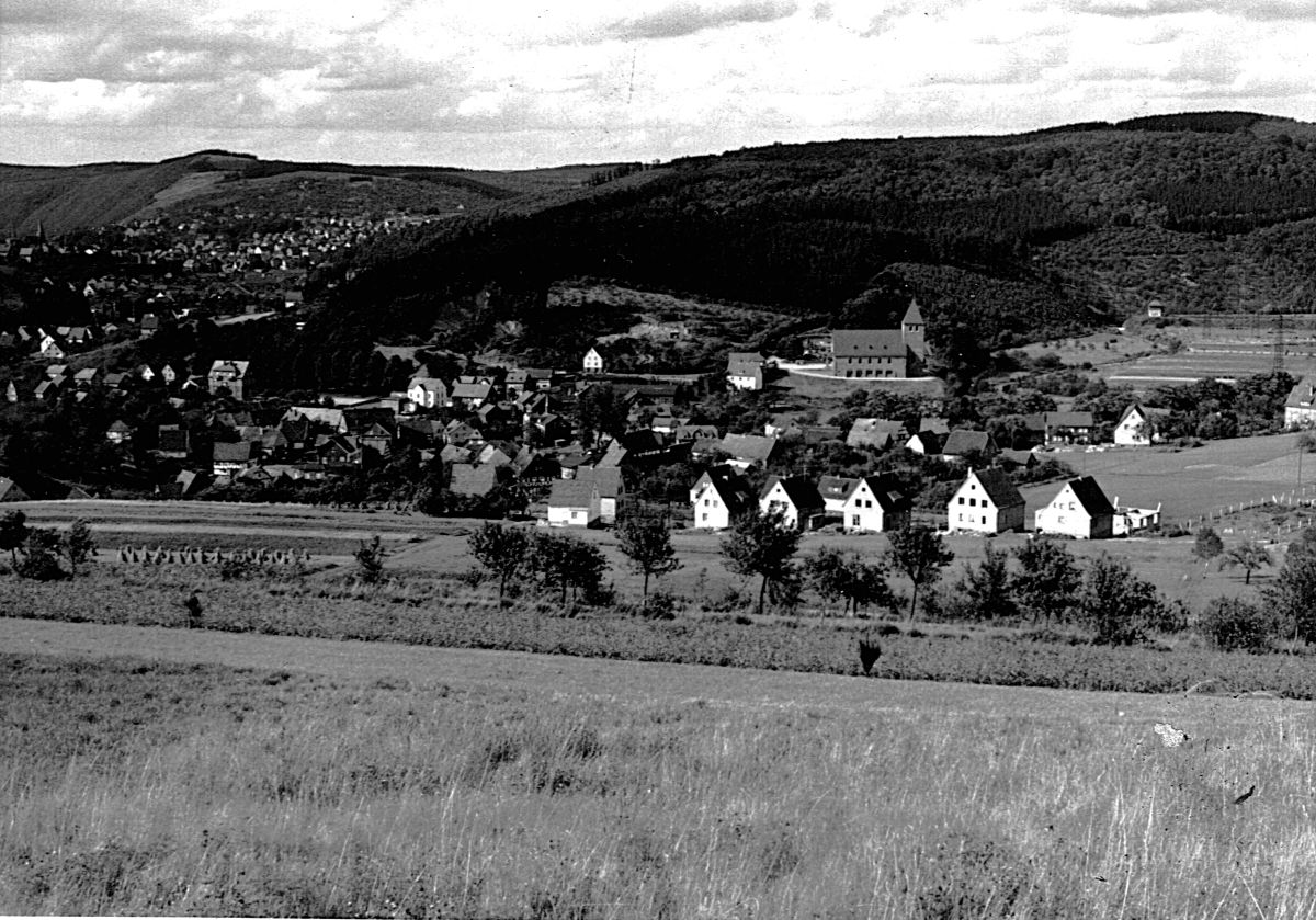Gesamtansicht von der Burg Richtung Arsberg. Am unteren Rand ist der Lagerplatz des Sägewerkes zu erkennen. Das markante Fachwerkhaus darüber ist das frühere Wohnhaus der Familie Wertmann, das wegen Verbreiterung der Hauptstraße Anfang der 1960-iger Jahre abgerissen wurde.