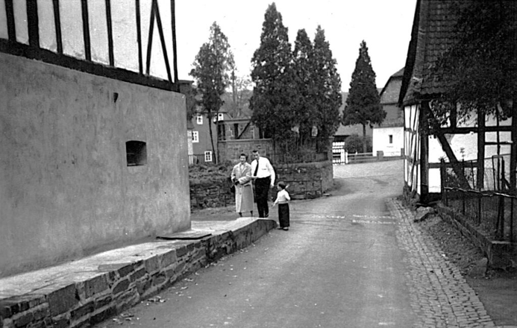 Blick aus der Lindenstraße in Richtung Hauptstraße. Links das Haus Göldner, rechts die Scheune, in der zur Zeit des Bergbaus eine Schmiede betrieben wurde. Auf der linken Seite (hinter den Personen) die Rückseite der Kriegerdenkmalanlage.