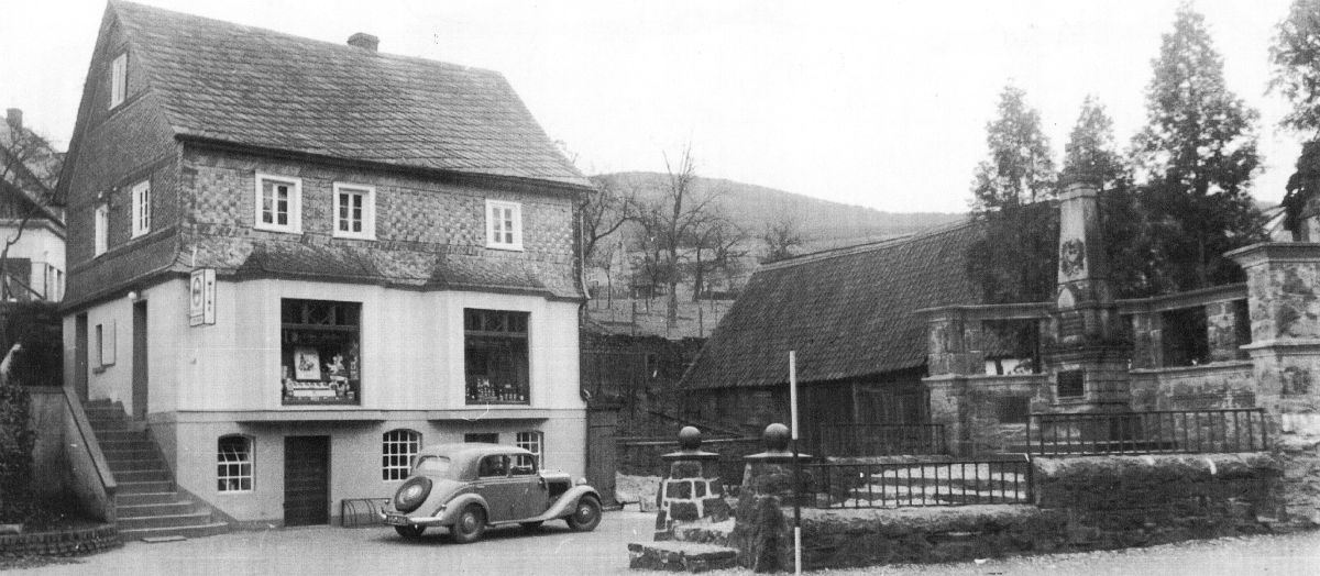 Der frühere Kolonialwarenladen von Otto Reeh in der Ortsmitte um das Jahr 1955 (links). Rechts das Kriegerdenkmal in der Weggabelung Lindenstraße / Hofacker. Die Scheune in der Bildmitte wurde Anfang der 1960-iger Jahre abgerissen. Heute steht dort das Wohnhaus der Familie Meiswinkel.