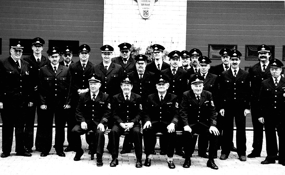 Mitglieder der Feuerwehr nach einem Einsatz für die Trinkwasserversorgung. In der vorderen Reihe der Zeite von Rechts: der spätere Brandmeister Wilfried Bauschert.