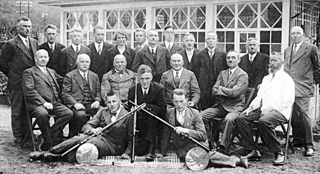 Der Kleinkaliberverein in den 1920-iger Jahren vor der Laube am Gasthof Alex Haubrich (später Dützer) auf der Haltestelle.
