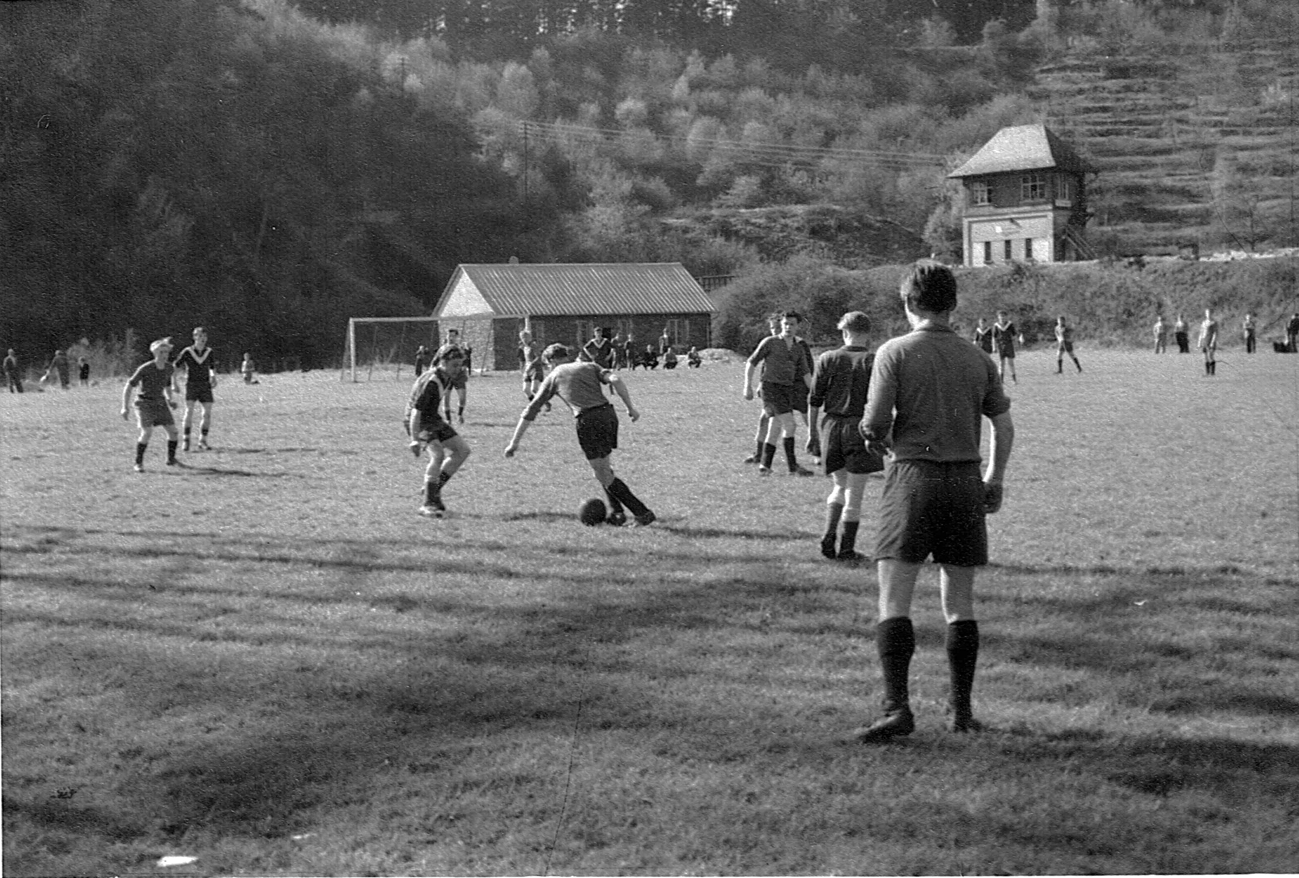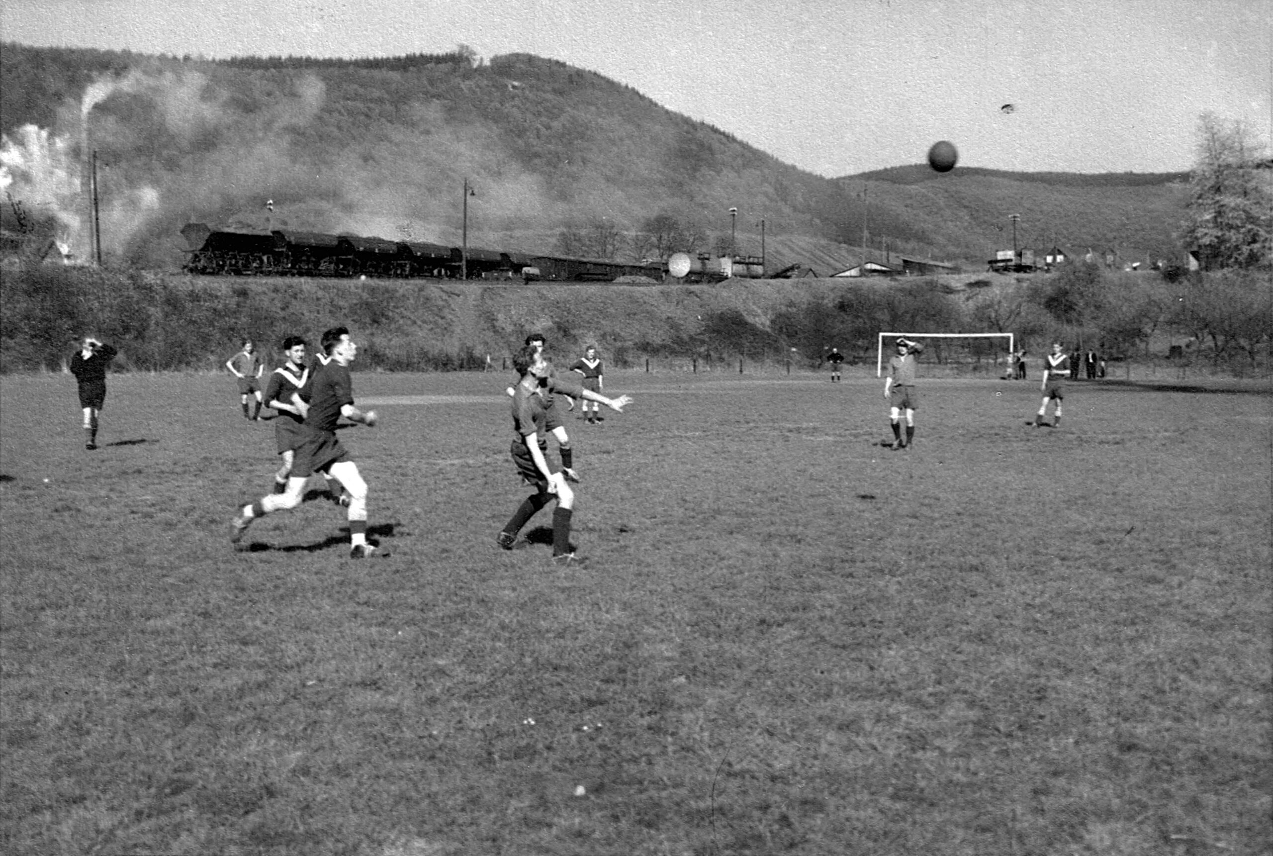 Spielszene auf dem Sportplatz. Links sieht man den Qualm der Grünebacher Hütte. Das Bild ist vcr 1963 entstanden, denn da erloschen die Feuer und die Hütte wurde stillgelegt.